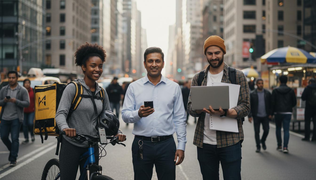 Figure 1: The gig economy workforce includes delivery drivers, rideshare operators, freelancers, and independent contractors from all walks of life.